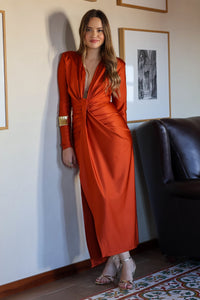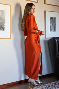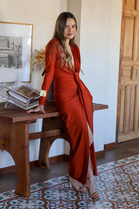 El nudo central y la abertura en la falda aportan un toque sensual sin perder la elegancia, convirtiéndolo en la elección perfecta para invitadas que buscan un look impactante y atemporal.