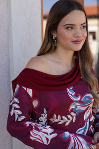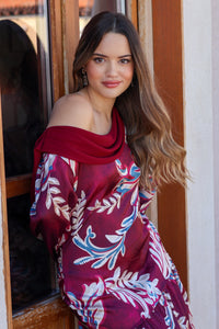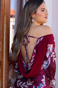 Elegancia y movimiento en cada paso. Confeccionado en un suave raso de acabado satinado, este vestido burdeos destaca por su delicado estampado de flores y su silueta fluida. El escote en la espalda aporta un toque sofisticado y femenino, mientras que las mangas largas equilibran el conjunto, creando una prenda ideal para invitadas que buscan estilo y comodidad.