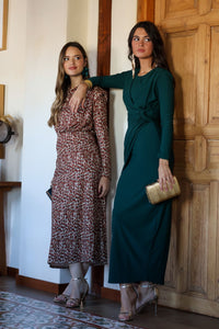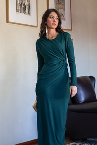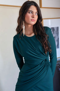 Este vestido es pura elegancia y estilo para tus eventos de invitada. Confeccionado en un tono verde muy favorecedor, destaca por su diseño entallado que realza la figura y su detalle de drapeado frontal con nudo lateral que aporta un toque sofisticado y estilizador.