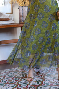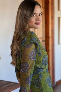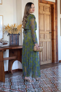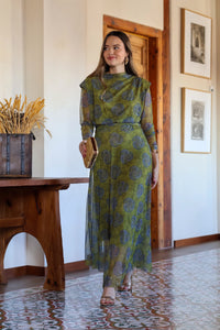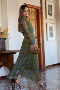 El vestido Novadeli verde es una de esas piezas que captan todas las miradas por su elegancia y originalidad. Su tejido de tul bordado con motivos circulares en hilo dorado aporta un brillo sutil y distinguido, ideal para los eventos más especiales.