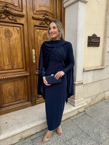 Este vestido es pura elegancia y estilo para tus eventos de invitada. Confeccionado en un tono azul marino muy favorecedor, destaca por su diseño entallado que realza la figura y su detalle de drapeado frontal con nudo lateral que aporta un toque sofisticado y estilizador.