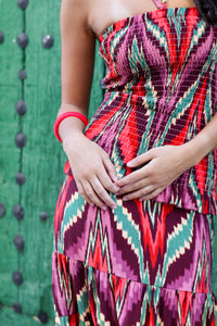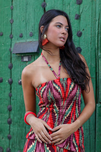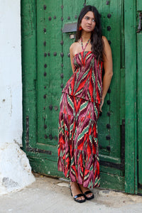 Dale un aire vibrante y lleno de personalidad a tu look con este vestido largo de tirantes. Su estampado geométrico en tonos rojos, verdes y coral crea un efecto visual único que estiliza y alarga la silueta.
