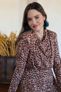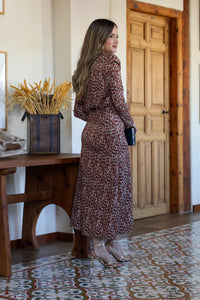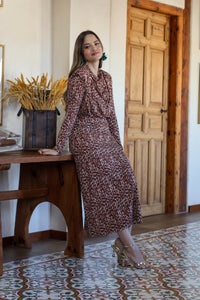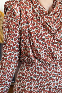 Este Vestido midi estampado en tonos camel es perfecto para una invitada en Otoño. Con hombreras, cuello cerrado y manga larga, te dará un look elegante y sofisticado. El estampado en tonos camel añade un toque único y moderno a tu outfit. ¡Destaca con este vestido!