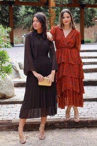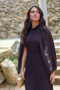 Disfruta de una noche elegante con el vestido midi de gasa en color marrón . Su corte sin mangas y su capa con tablas te darán un look sofisticado y cómodo. Perfecto para invitadas de noche.
